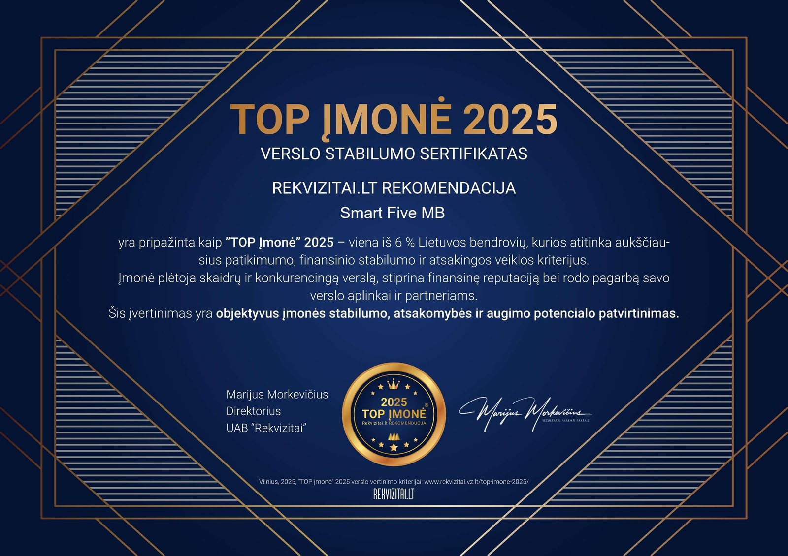 Džiaugiamės galėdami pranešti, kad MB Smart Five pelnė prestižinį Rekvizitai.lt „TOP Įmonė 2025“ sertifikatą! Tai didelis įvertinimas – tik 6 % Lietuvos įmonių atitinka griežtus patikimumo, skaidrumo ir atsakomybės kriterijus, o mes esame tarp jų!