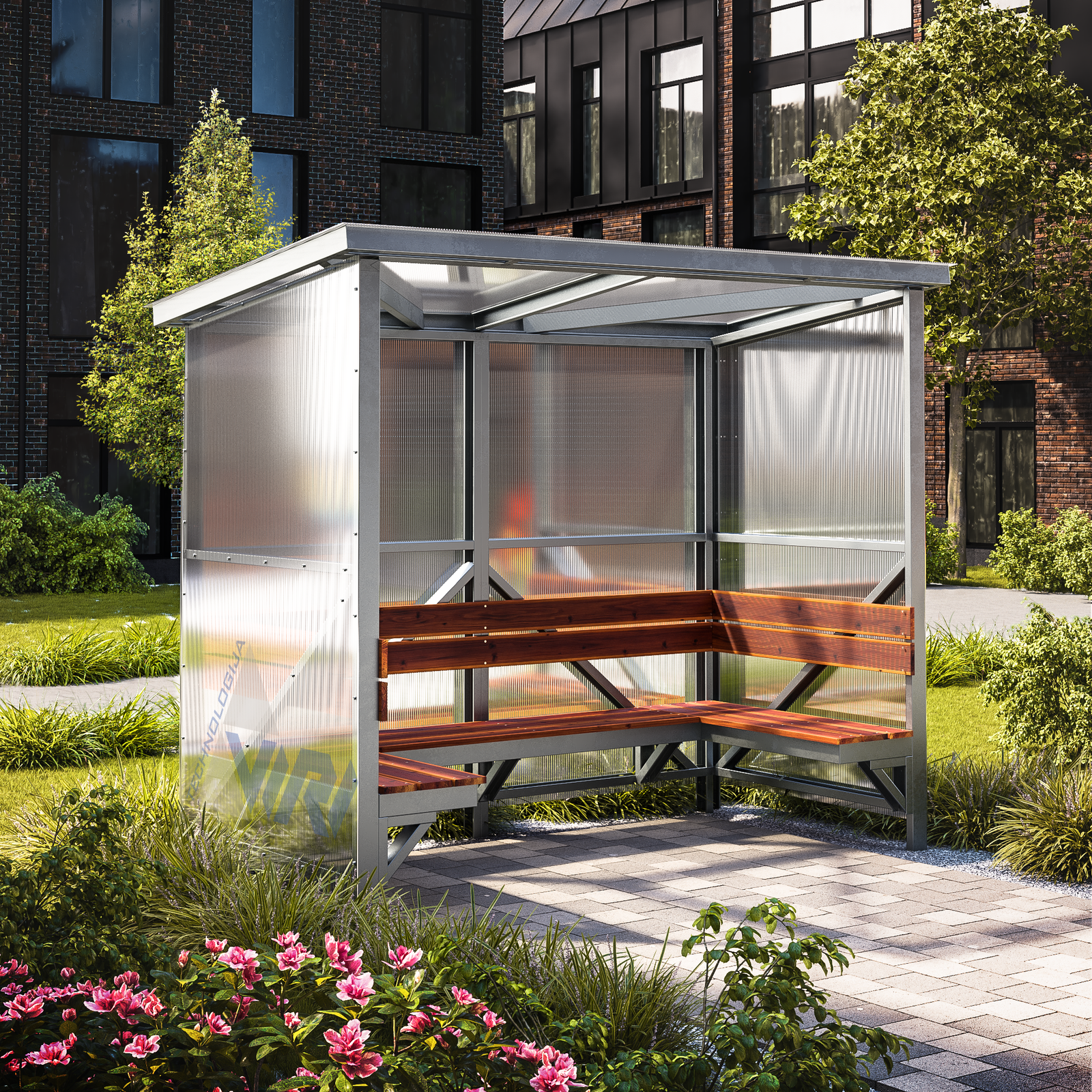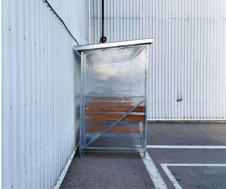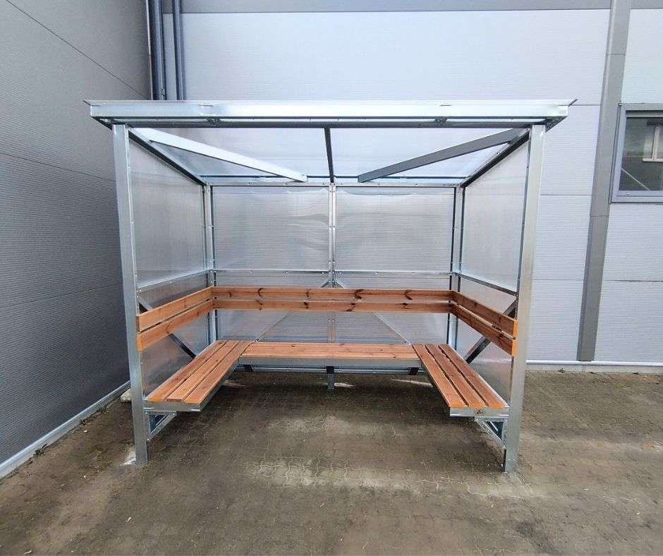 Apsauga nuo oro sąlygų: Sienos ir stogas iš 4 mm polikarbonato, apsaugančio nuo lietaus ir stipraus vėjo.