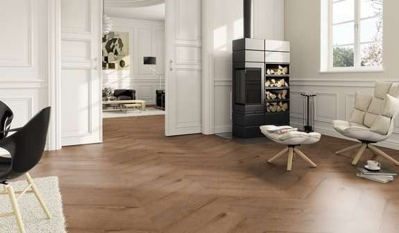 Pilkšvai rudo ąžuolo atspalvio vinilinės grindys ter Hürne PRO Chevron Oak Washington – eglės šakos rašto, matinio paviršiaus grindys. Atsparios drėgmei, tyliai vaikščiojamos, tvirtos ir ilgaamžės.